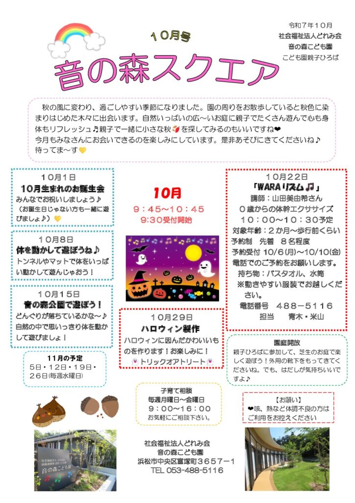 まだまだ残暑が厳しい日もありますが、朝晩は少しずつ涼しい風が吹き始め、過ごしやすい秋がやってきました♪9月は暑い中たくさんの子どもたちが遊びにきてくださり、とても楽しく過ごすことができました。10月はお外でどんぐりを拾ったり、音の森公園で遊んだりしたいな~🎵