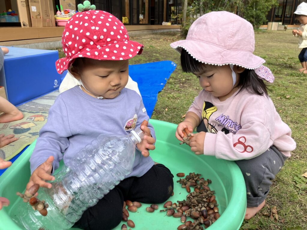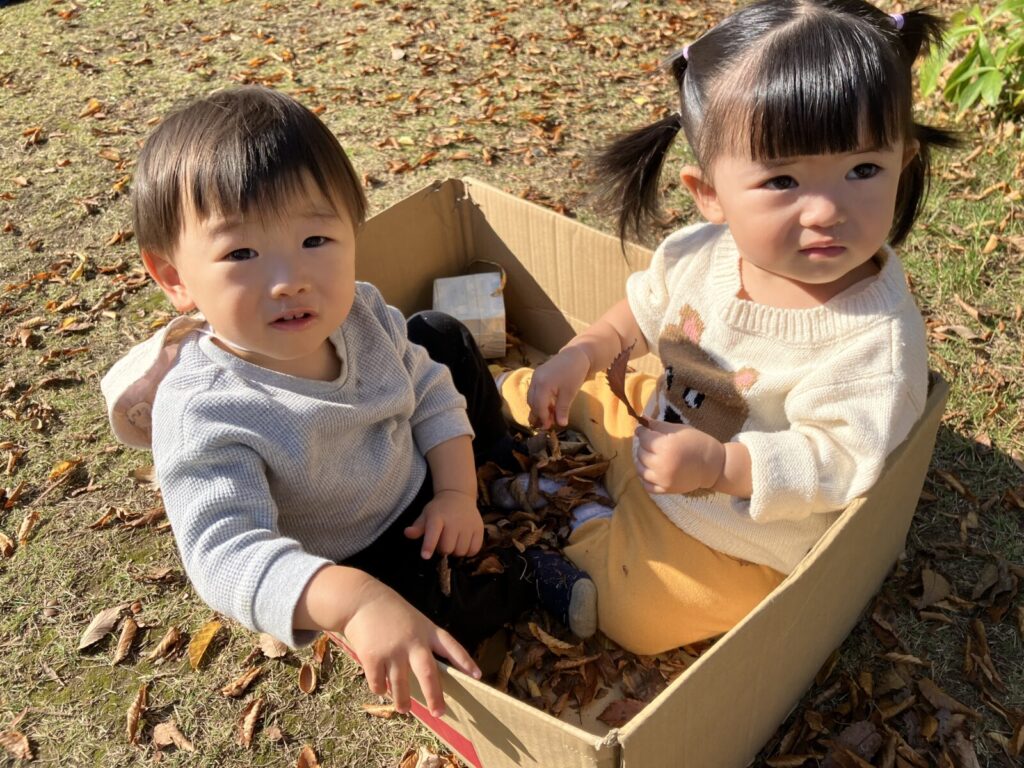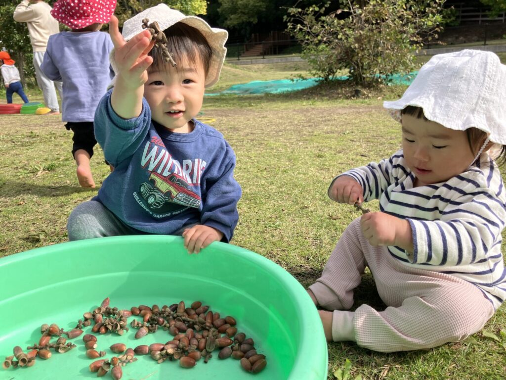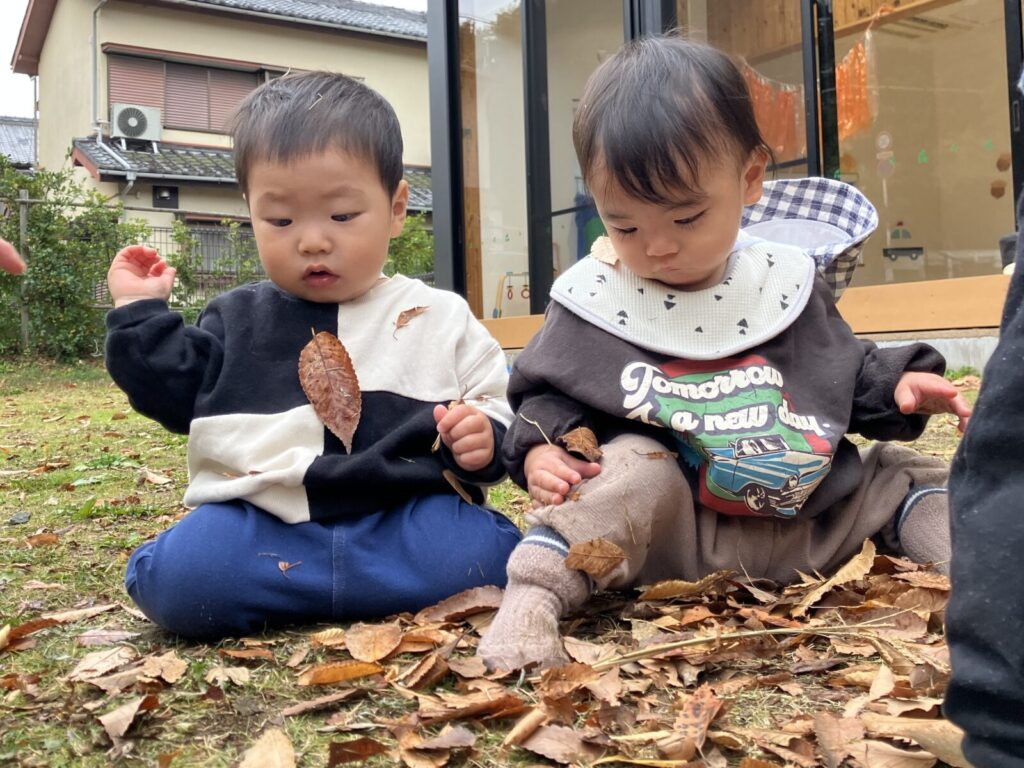 園庭にはどんぐりや赤や黄色、茶色など・・いろんな色の落ち葉がい~っぱい!葉っぱやどんぐりを見つけると「はっぱ!」「あった!」と嬉しそうに教えてくれるハープさんです!💕