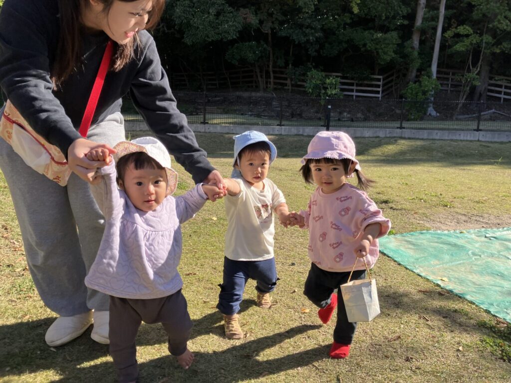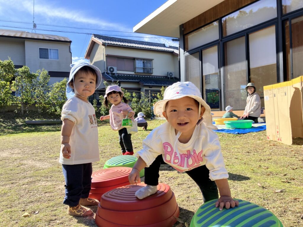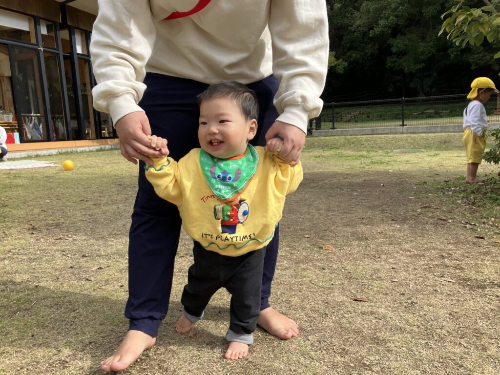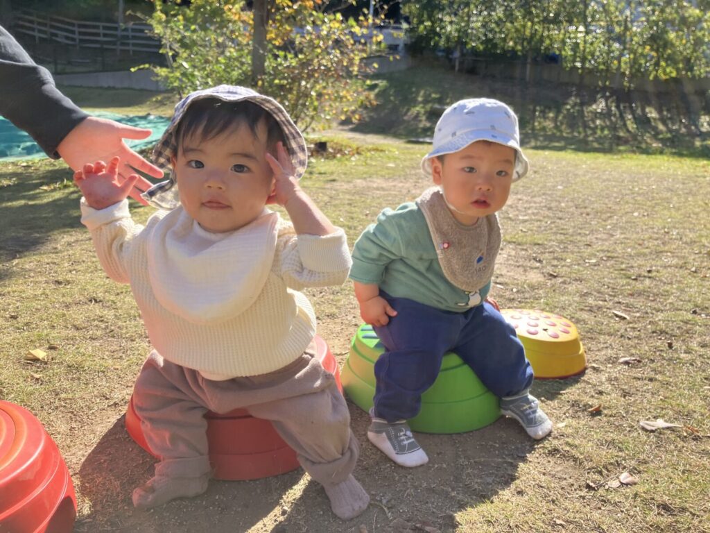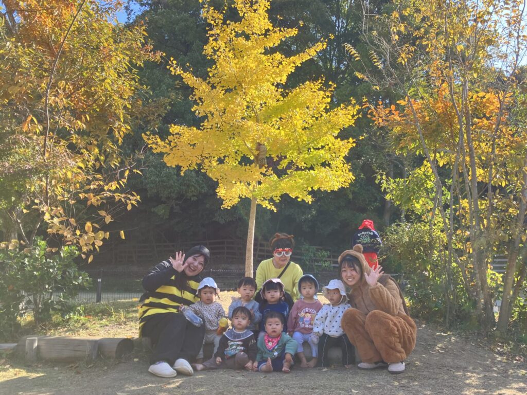 園庭にはどんぐりや赤や黄色、茶色など・・いろんな色の落ち葉がい~っぱい!葉っぱやどんぐりを見つけると「はっぱ!」「あった!」と嬉しそうに教えてくれるハープさんです!💕