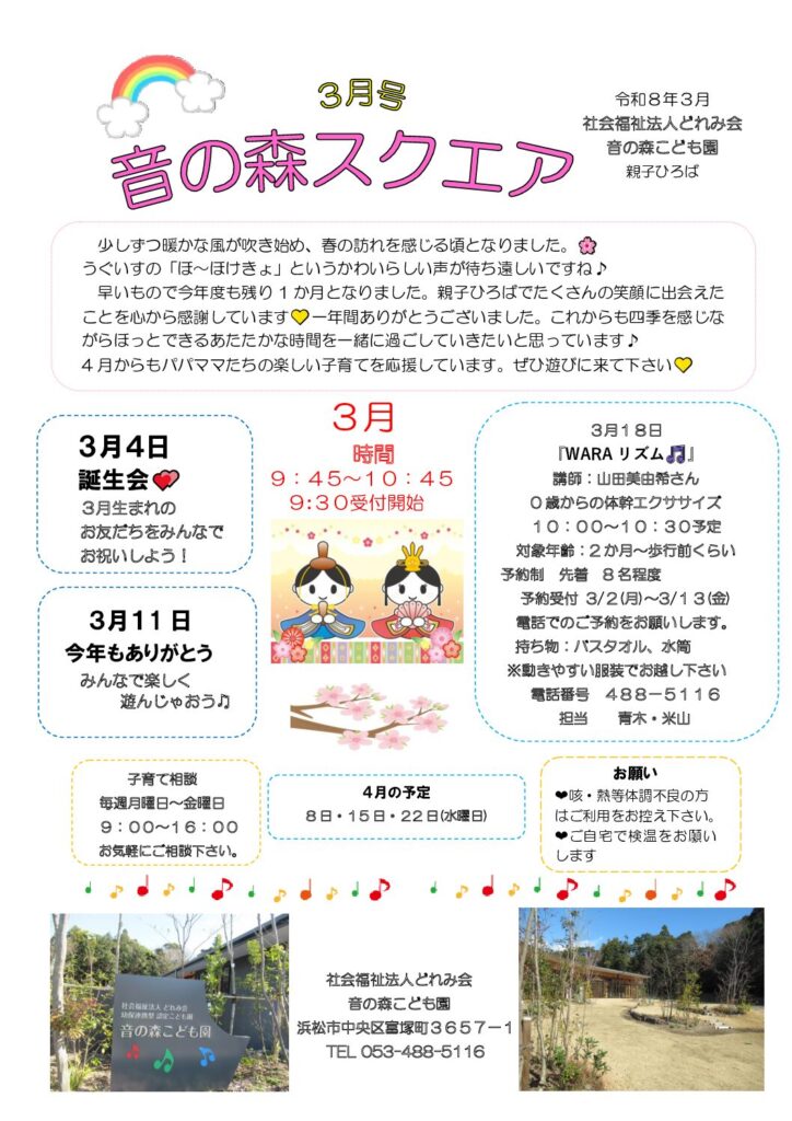 やわらかな日差しに春の訪れを感じる頃となりました。今年度もたくさんの皆さまにご参加いただき、心より感謝申し上げます。親子ひろばを通して、たくさんのお友だちやおうちの方々と出会えたことをとてもうれしく思っています。また、今年度初めての試みとして講師の先生をお迎えし、月に一度のWARAリズム♫も好評で、笑顔あふれる時間となりました。来年度も「ゆっくりのびのび大きくなぁれ」の思いを大切に、親子でほっとできる場をつくってまいります。ぜひ遊びに来てくださいね♪