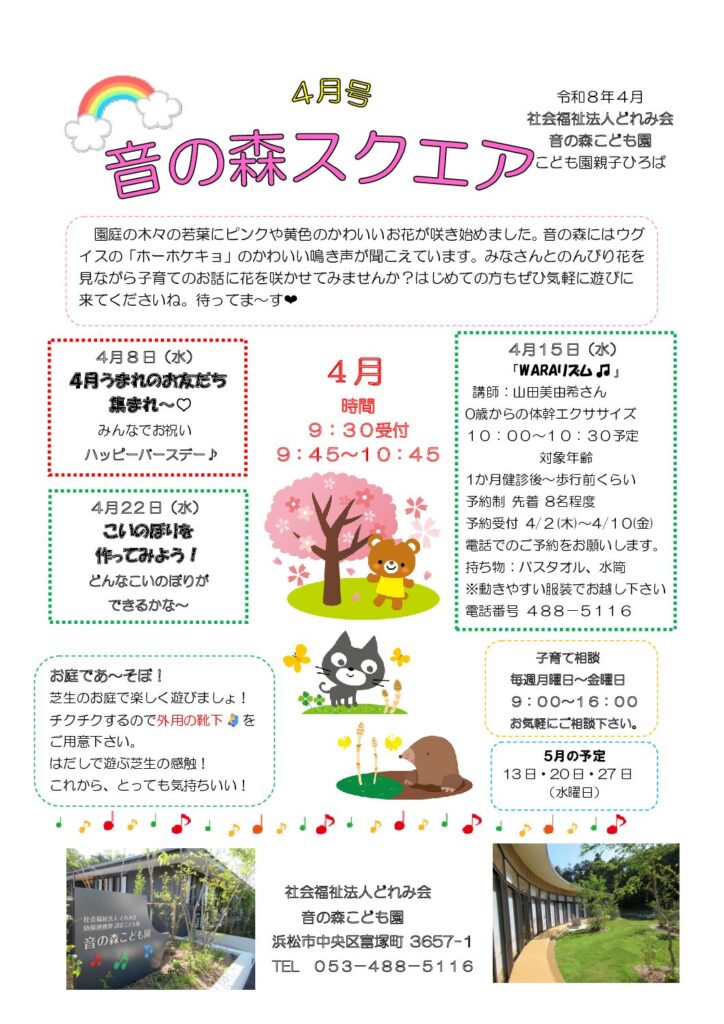 音の森にかわいらしい「ホーホケキョ」の鳴き声が聞こえてきました♪季節はもう春ですね♪いよいよ新年度のスタートです。これまで来てくださっている皆さんはもちろんのこと、これから出会う新しい親子のみなさんとも温かい時間を育んでいきたいと思っています。ちょっと遊びに来るだけでも大歓迎♪おしゃべりしたりホッと一息ついたり・・・お子さんと一緒に笑い合えるそんな何気ない時間を一緒に過ごせたらいいなと思っています♪気軽に遊びに来てくださいね♡今年度もよろしくお願いいたします。